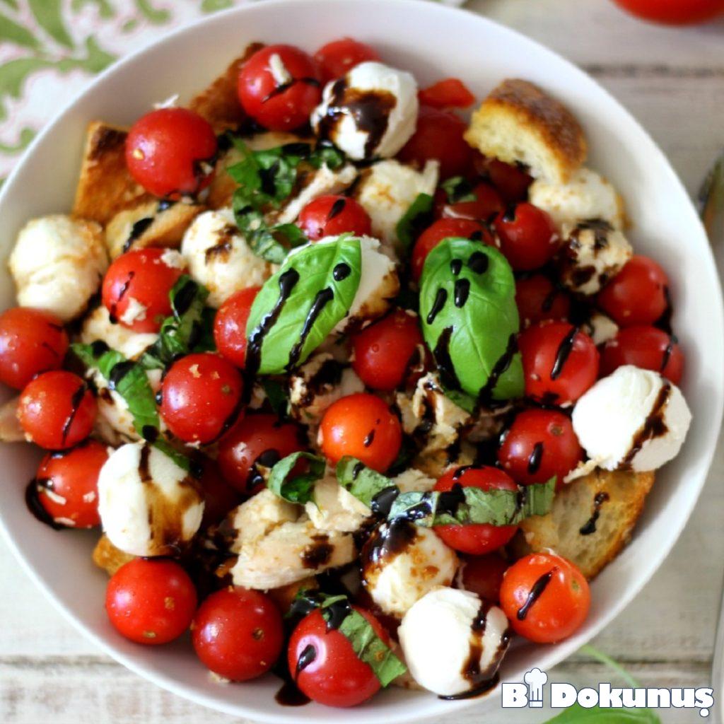 - Mozzarella peyniri, çilek, fesleğen, kızarmış ekmek ve Sosunu domatesli kaseye ekleyin; iyice karışana kadar fırlatın ve sallayın.