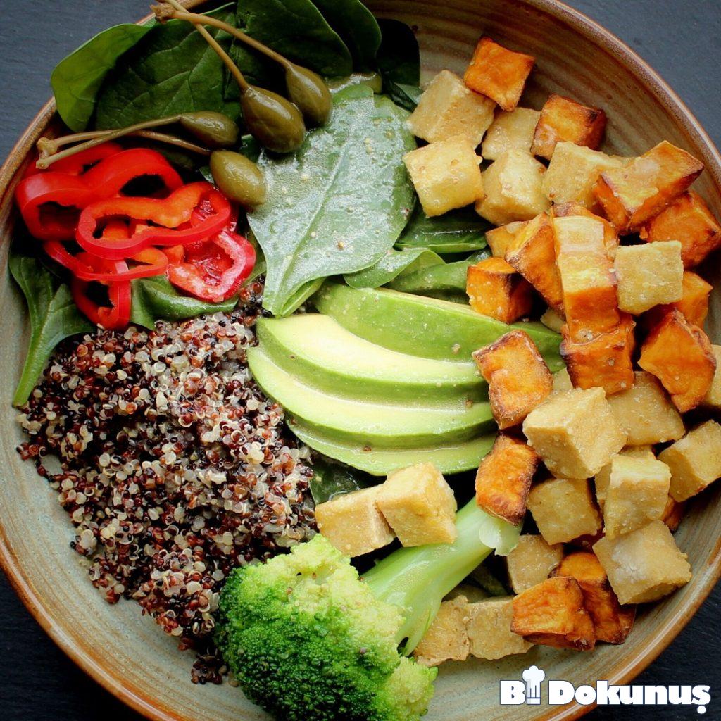 - Sosu geniş bir kaseye dökün. Sonrasında tatlı patates, tofu küpleri, avokado, karışık yeşillikler, brokoli, kırmızı dolmalık biber, kapari ve fesleğen ekleyin ve güzelce karıştırın.