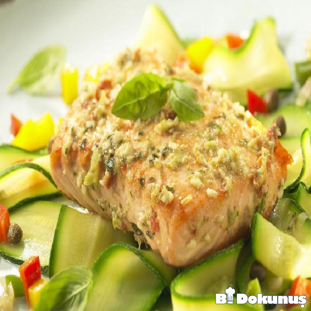 - Üzerine antepfıstığı karışımı ekleyin, karışımı somon üzerine bastırın.