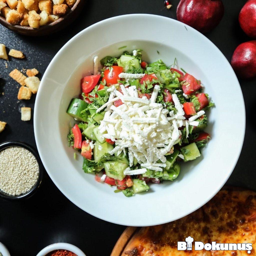 - Şopska salatasının üzerine beyaz peynir rendelenir.