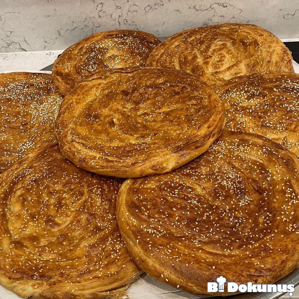 - Mayalandıktan sonra hamurdan avuç büyüklüğünde parçalar koparıp merdane yardımıyla yuvarlak bir biçimde açın.